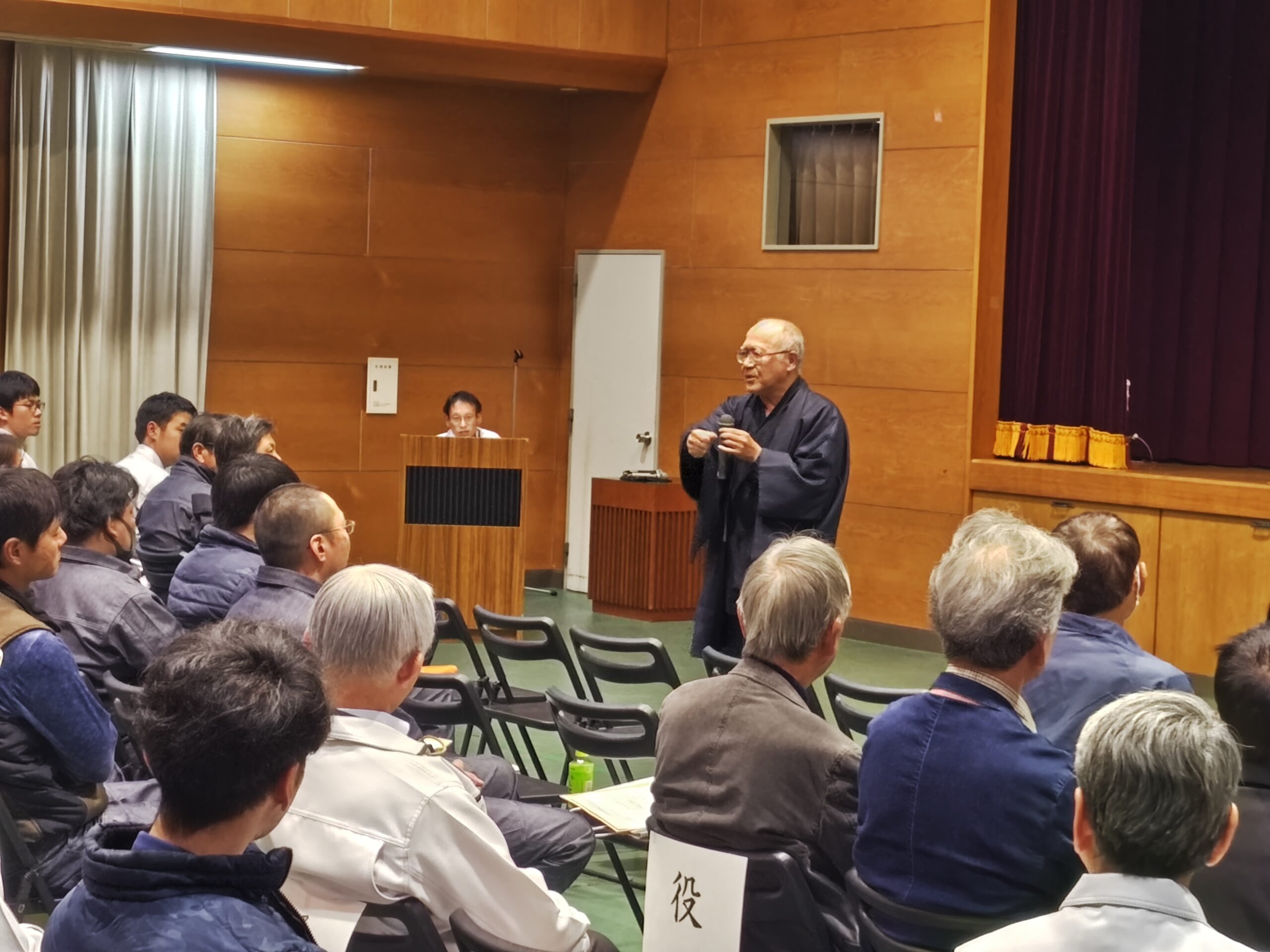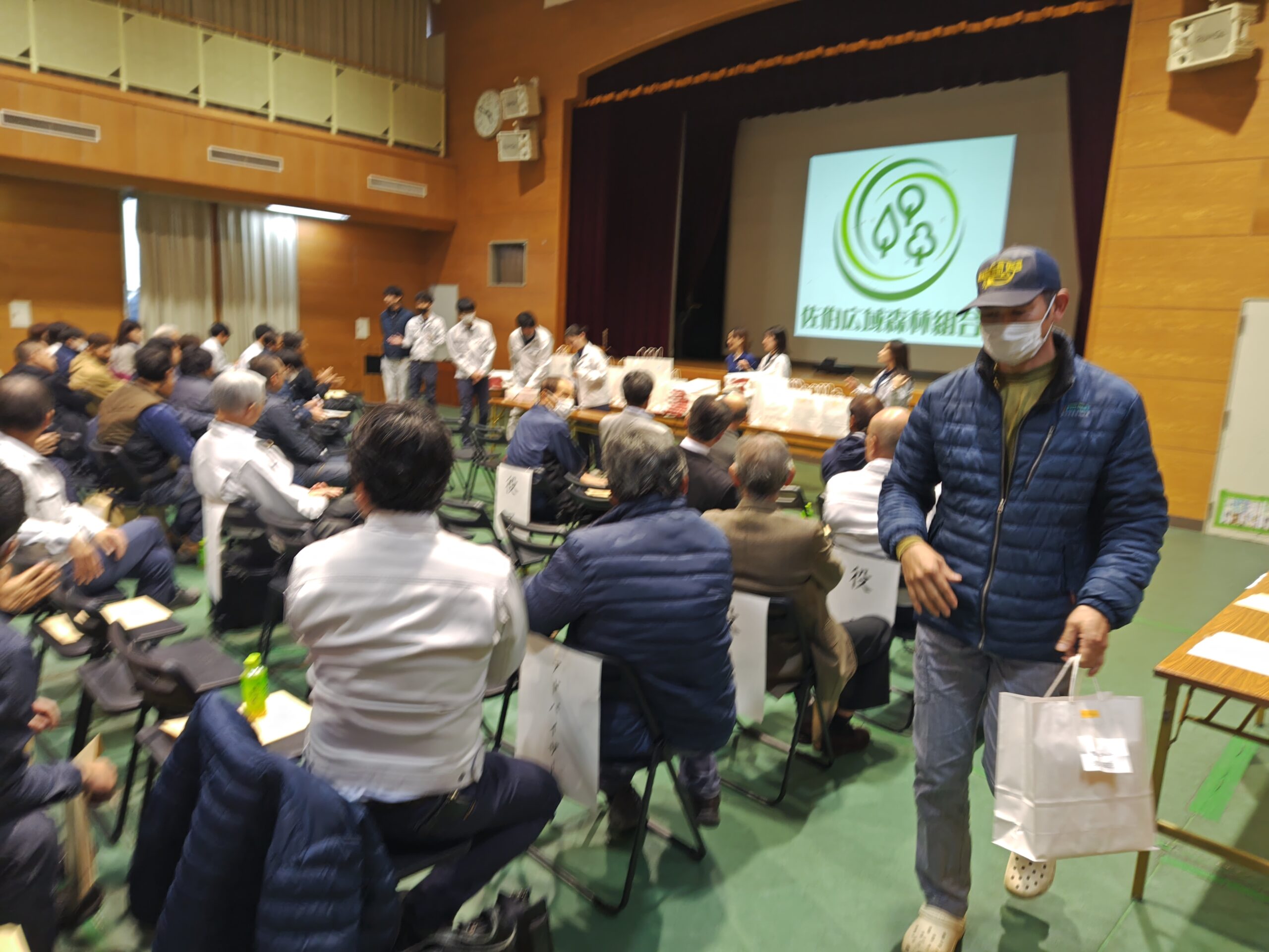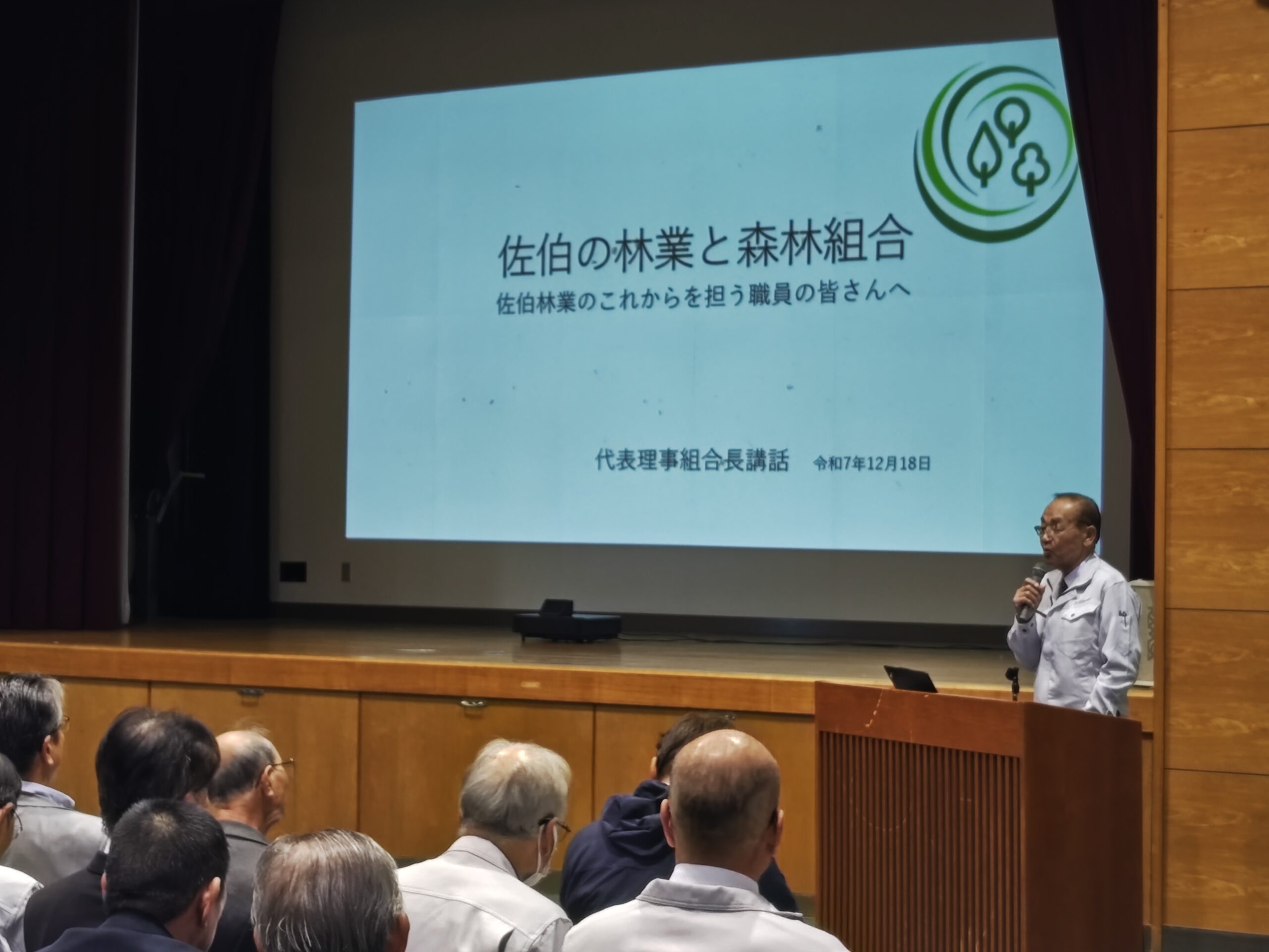 「企業の社会的責任」と「笑えば職場の潤滑油」というテーマの講演のあと、流通部よりツーバイ工場についての説明がありました。また、組合長には、佐伯の林業の講話をしていただき、自身が経験してきた林業を通じてこれからの職員に期待することについてお話しいただきました。
